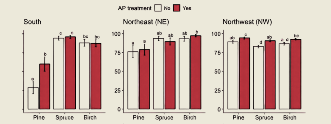 The survival advantage is observed in pine, spruce, and birch, across multiple Nordic climate zones.